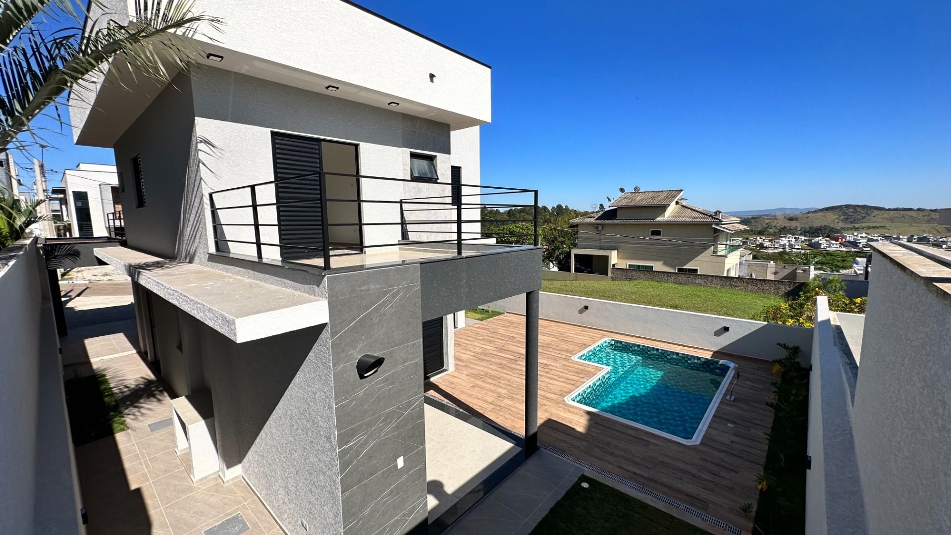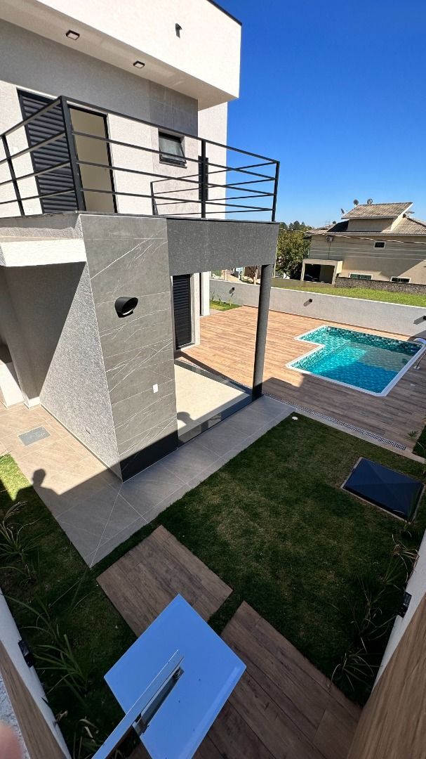 Lindo sobrado 3 quartos sendo duas suites com sacada, cozinha integrada com a area guormet, sala de jantar, sala de estar, sala de tv, ampla area gourmet, com churrasqueira integrada com a piscina, deposito, piscina com iluminação de led, hidromassagem, cascata, casa preparada para auecimento solar, preparada para ar condicionado nos quartos e sala ,acabamento de alto padrão, revestimentos em porcelanato, bancadas em granito , louças e metais de excelente qualidade, portas internas prontas com acabamento UV, esquadrias de aluminio preta